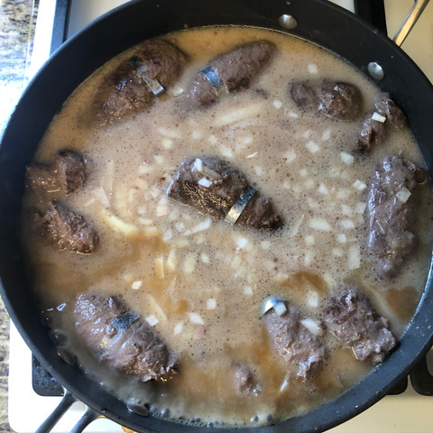 Each rouladen then goes directly into a hot frying pan with some vegetable oil to be browned. Make sure you healthily brown the rouladen on all sides (this is important if you do it until the meat is just grey your gravy will be grey, not golden brown). Then add the cold gravy mixture (below) it needs to be cold so it doesn't boil too fast and get lumpy to the pan with the browned rouladen. You will have onion bits that fell out of the rouladen when you rolled them up, scrape them off the counter and add them to the gravy and season with salt and pepper. The rouladen will simmer in this gravy for the next few hours. You can put them in a crockpot for 6 hours, or oven at 325 for 2 hours. You can also do it on the stovetop but you have to watch it closely to make sure it doesn't burn on the bottom. As it cooks this sauce will thicken and mix with the water and other juices to create an awesome gravy that we laughingly and lovingly call “Rouladen Soup!